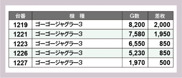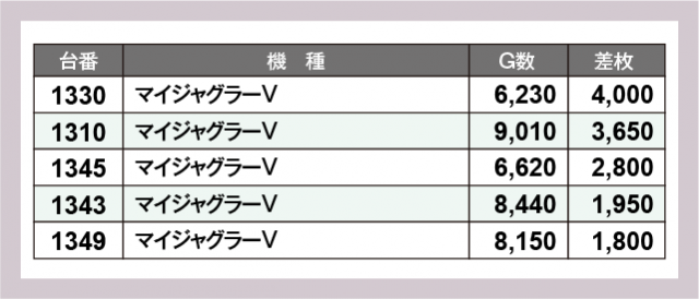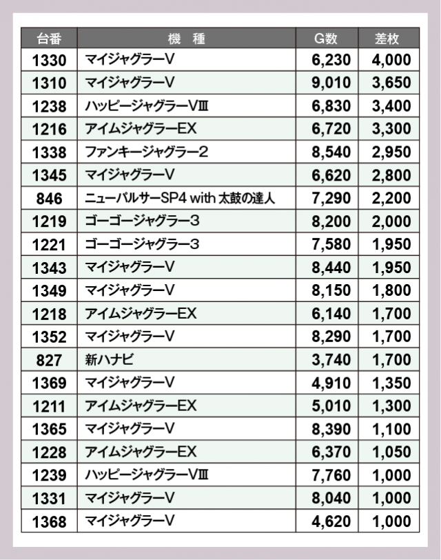 ※差枚数順に掲載しています