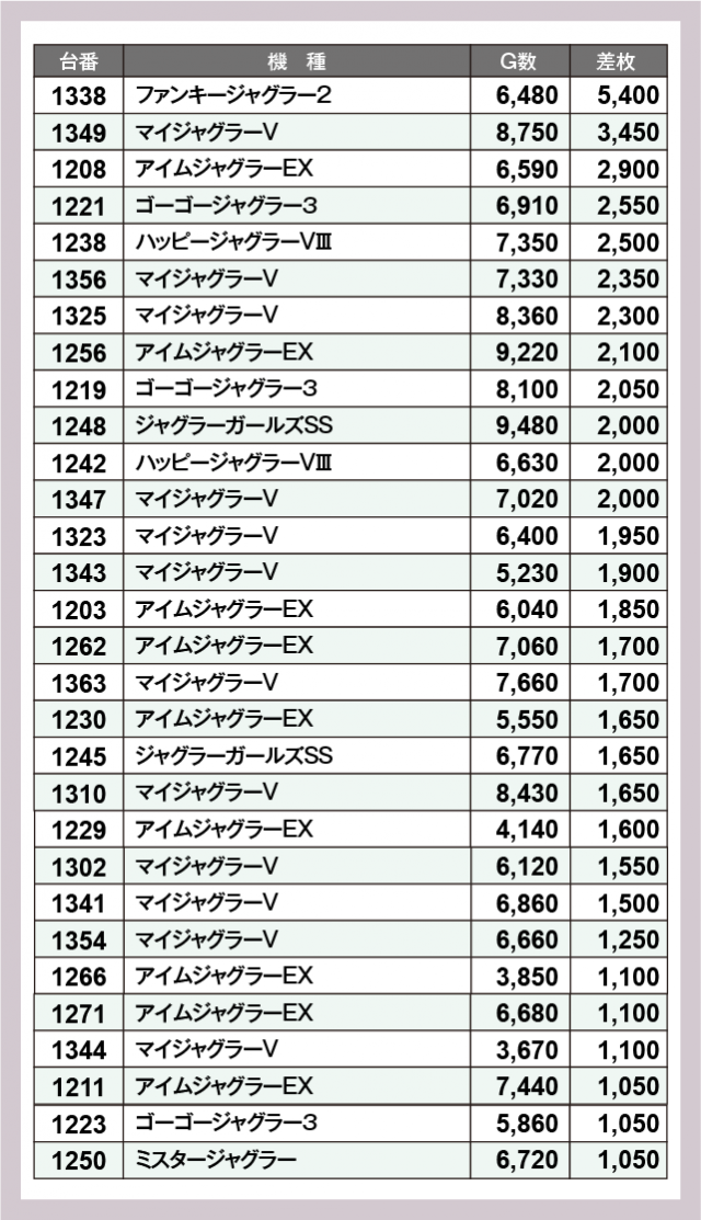 ※差枚数順に掲載しています