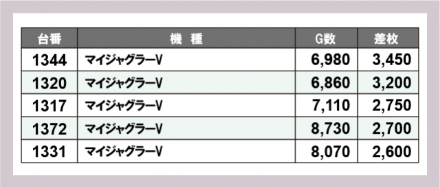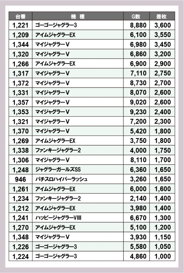 ※差枚数順に掲載しています