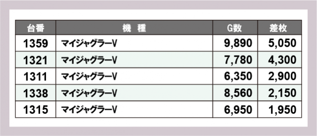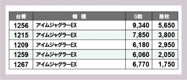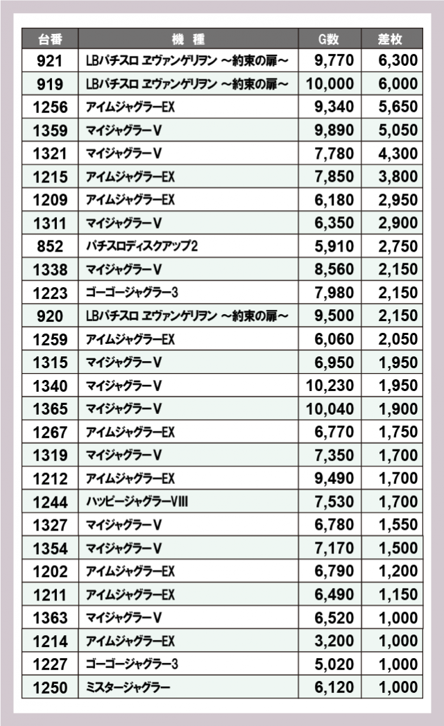 ※差枚数順に掲載しています