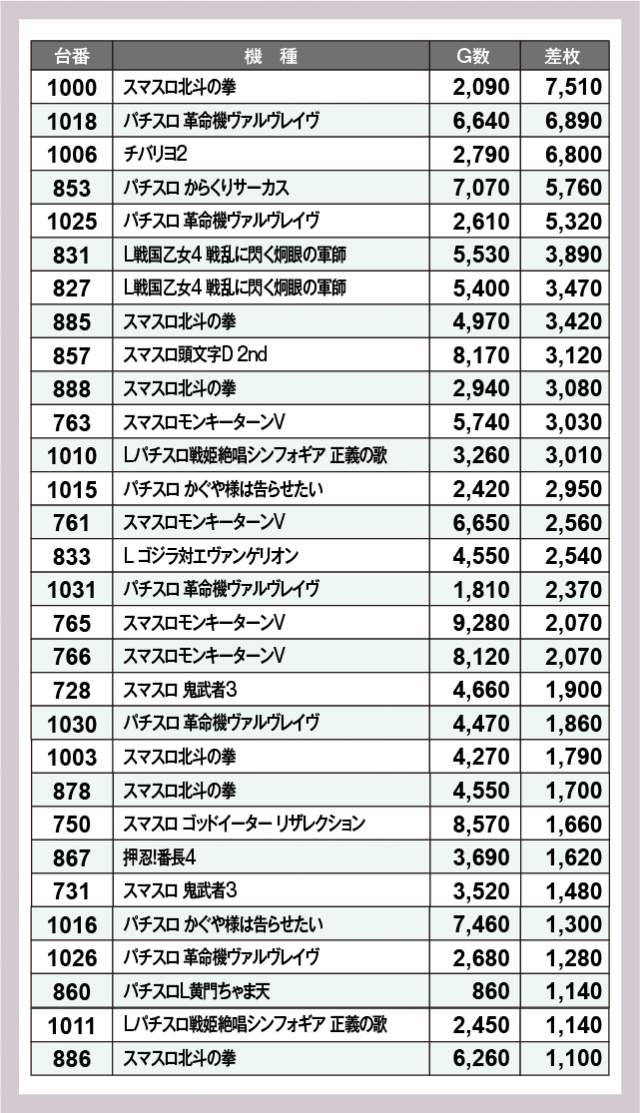 ※差枚数順に掲載しています