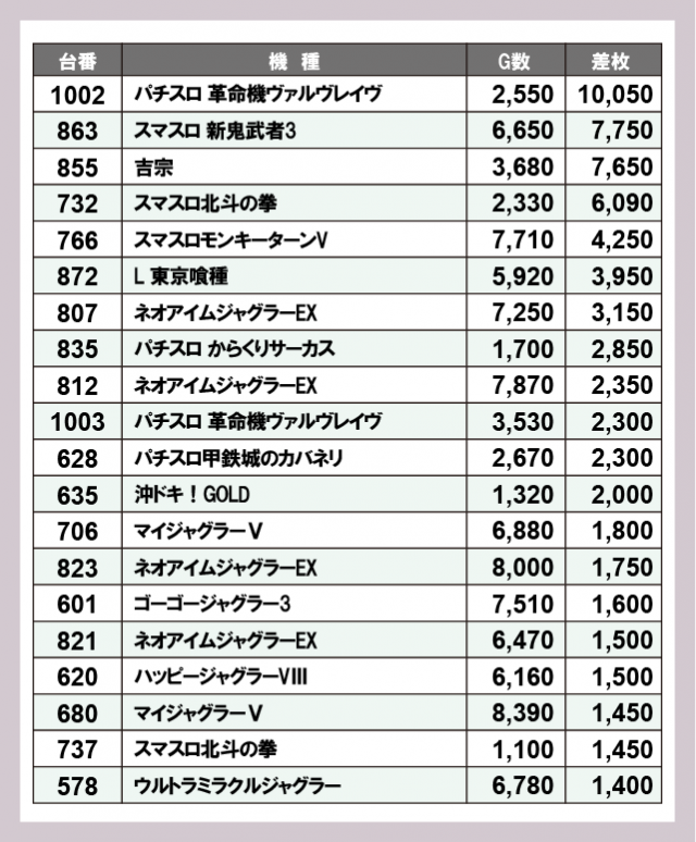 ※差枚数順に掲載しています