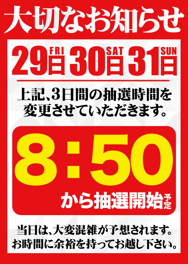 下記3日間、抽選時間変更となります。