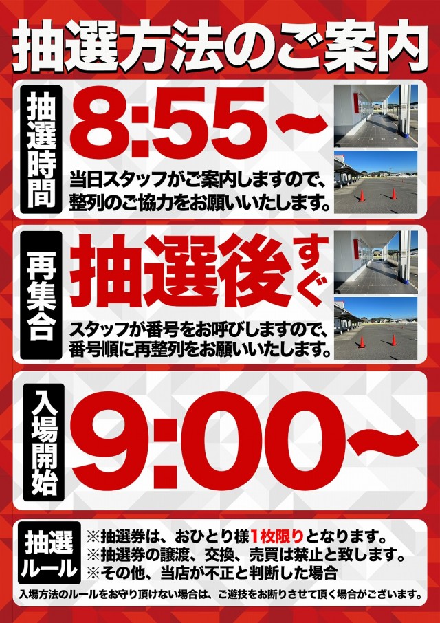 8:55までにお集まりいただいたお客様を対象に、入場順番券を配布いたします。 |