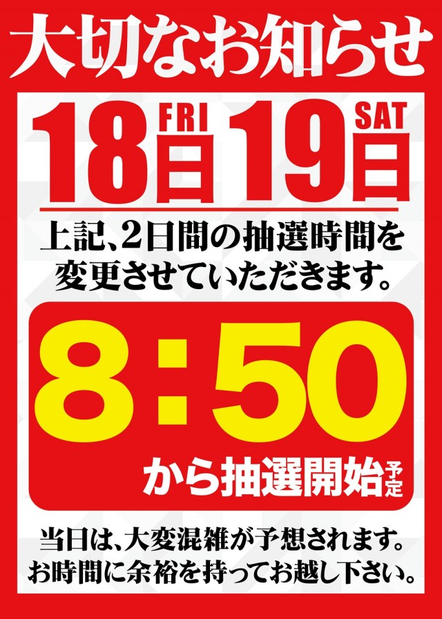 8:55までにお集まりいただいたお客様を対象に、入場順番券を配布いたします。 |