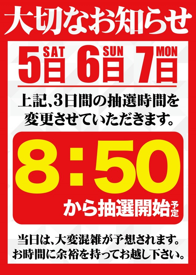 8:55までにお集まりいただいたお客様を対象に、入場順番券を配布いたします。 |