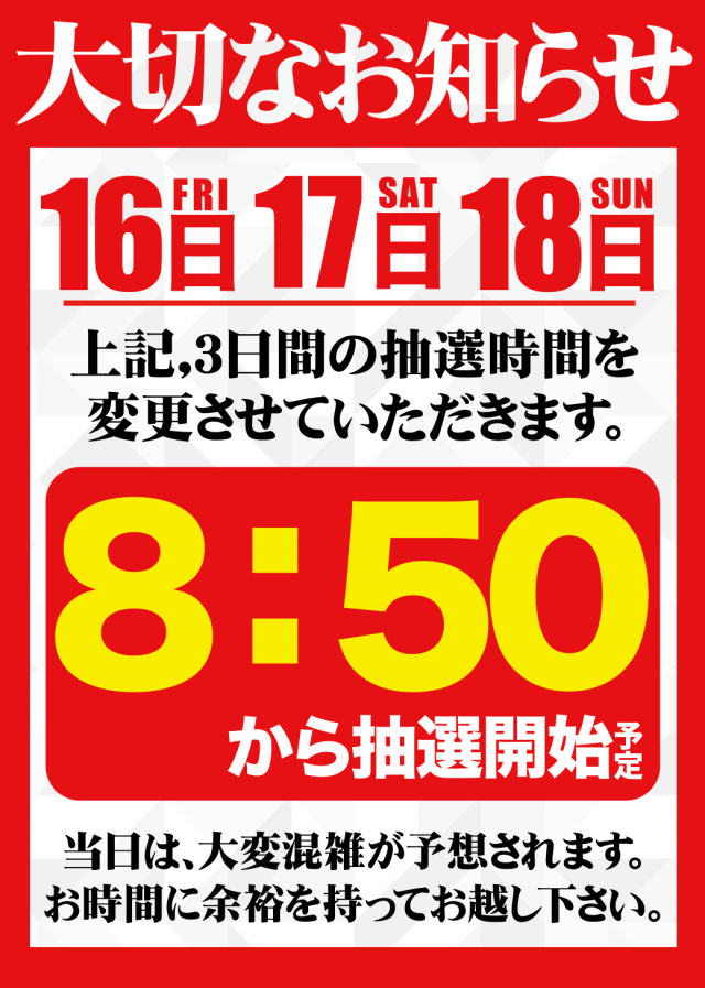8:55までにお集まりいただいたお客様を対象に、入場順番券を配布いたします。 |