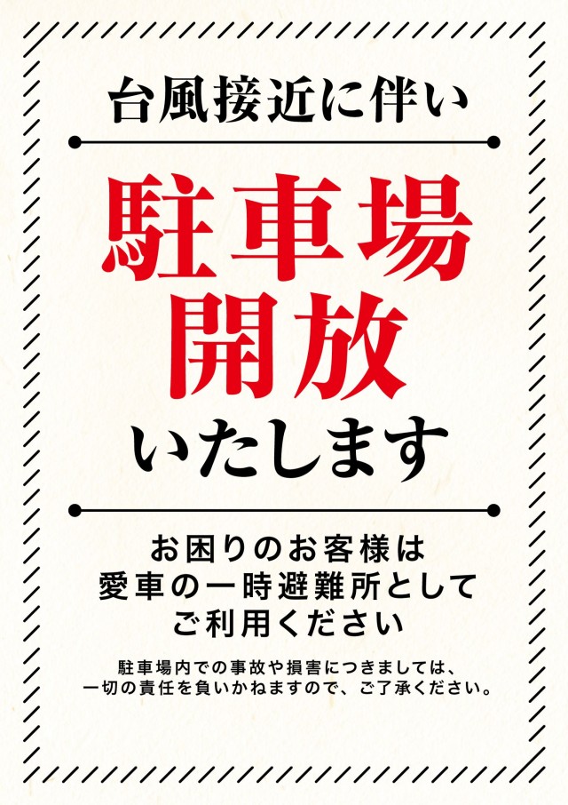 台風接近に伴い駐車場開放致します一時避難所としてご利用下さい