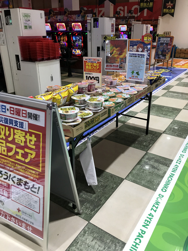 この日はお取り寄せ景品フェアを実施。熊本県から取り寄せた様々な食料品を提供していた。