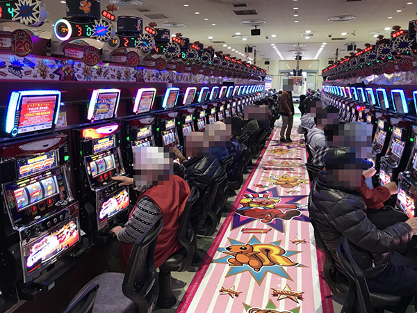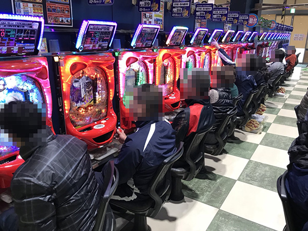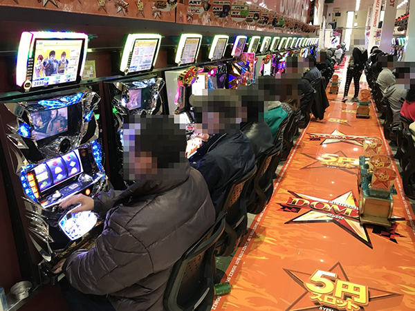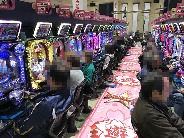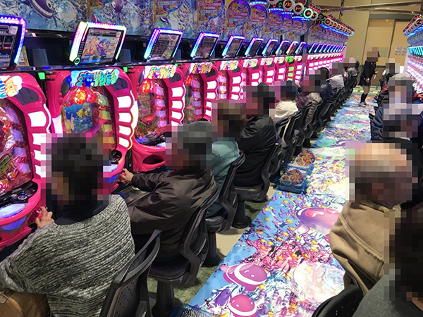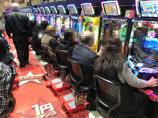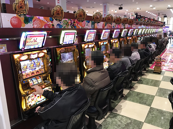 取材日の店内には多くのプレイヤーが集まっており、パチンコ・パチスロの各シマからにぎわいが感じられた。