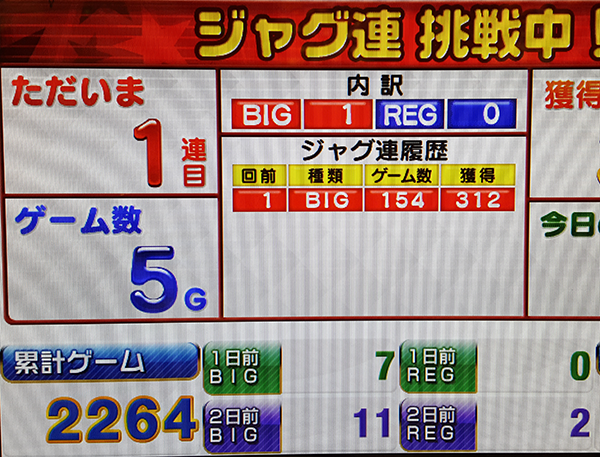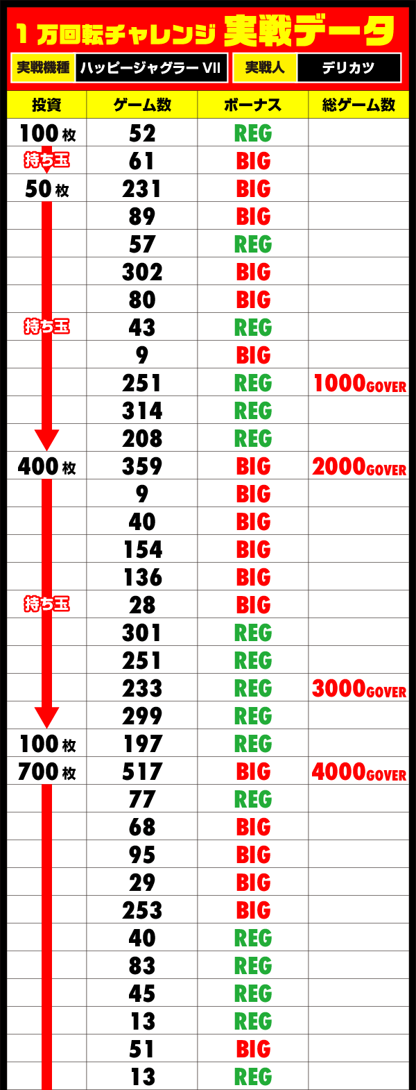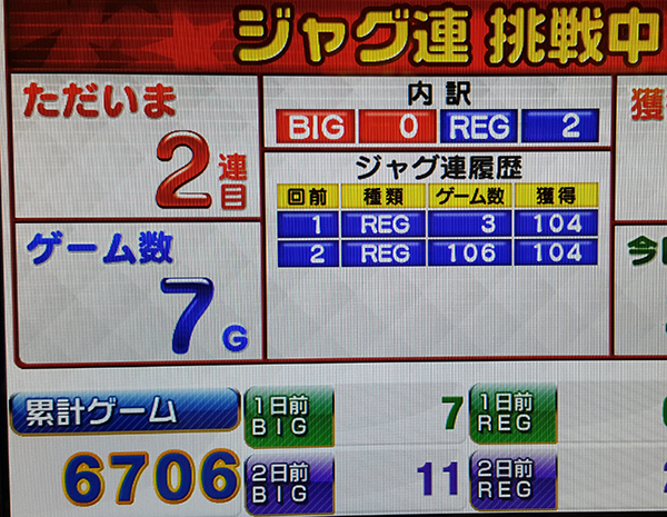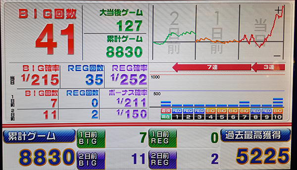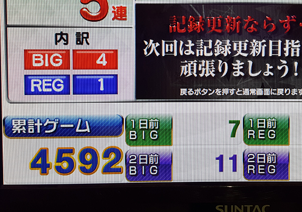 4700Gを通過したあたりからはテンポよくボーナスを獲得する回数が増えて、出玉面でもパフォーマンスをみせるデリカツ。少しずつ遅くなっていく通常時の消化ペースは気になるところだが、ダブル達成も夢ではないぞ!!