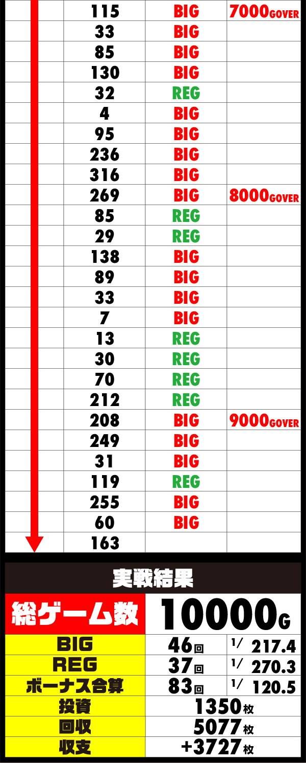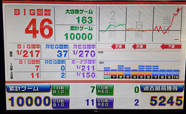 最後まで気をゆるめることなくレバーを叩き、最終的にはプラス差枚を維持したまま1万回転に到達! 勝利と成功を同時に手にするといった優秀な結果を残した。