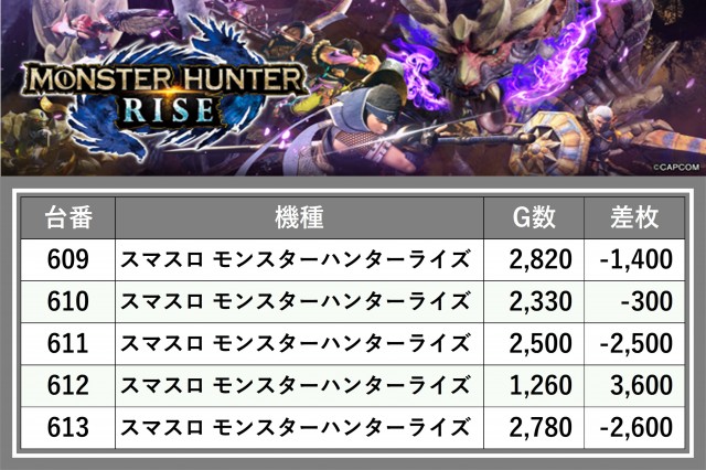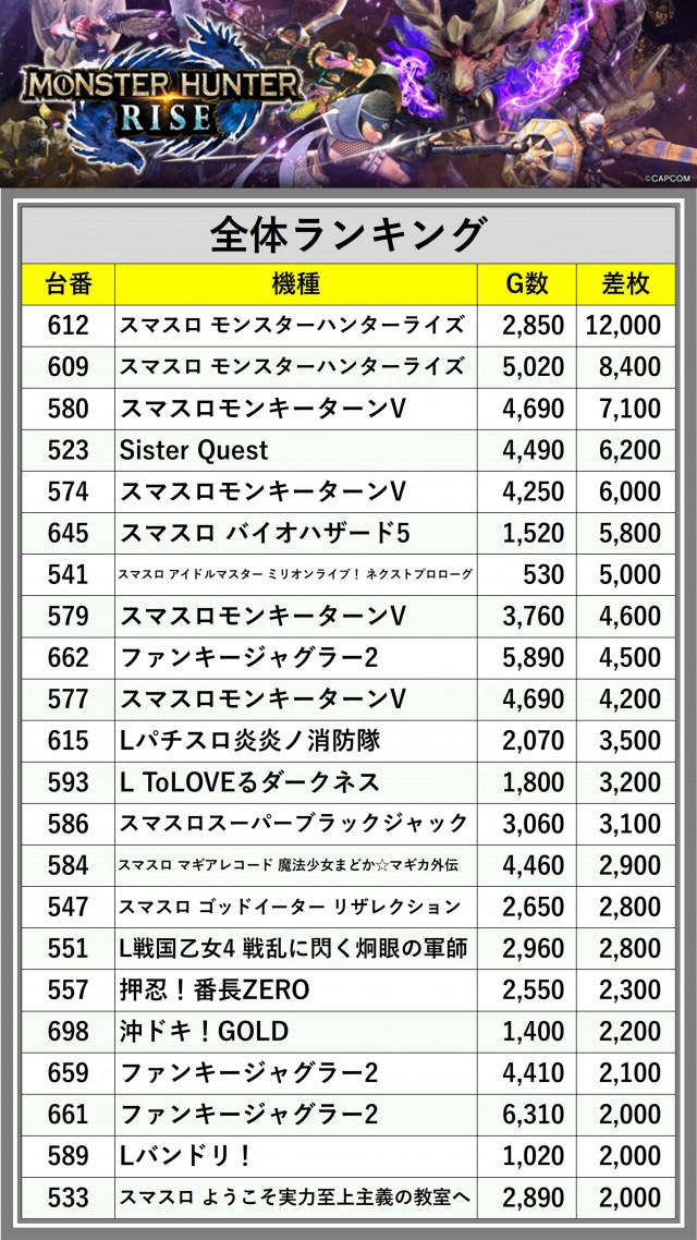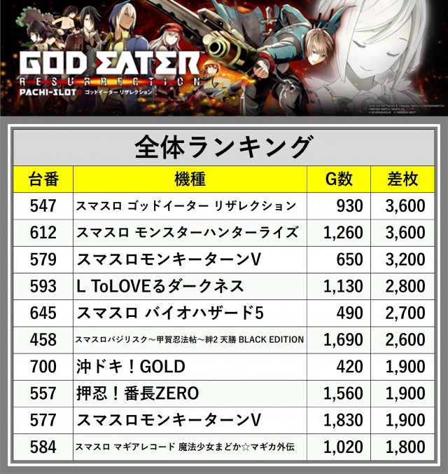 厳選された取材対象機種をはじめ、その他スロット全体から好記録が飛び出した!プレイヤーが楽しんだ1日を下記データにて振り返ってみて欲しい。