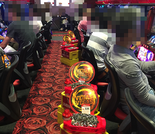 パチンコもパチスロも多くの席が埋まり、各シマから華やかな雰囲気が感じられた「ベガスベガス周南店」。