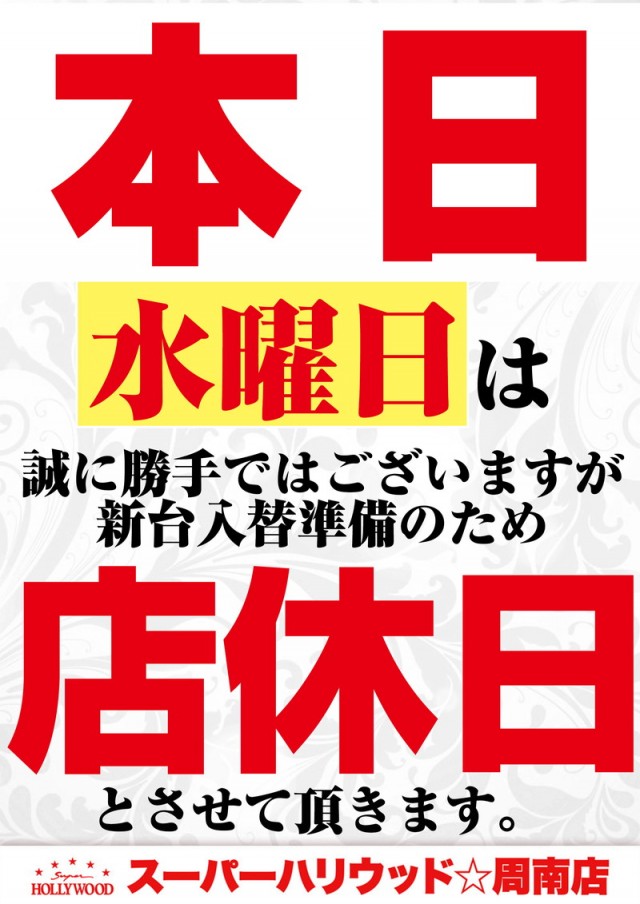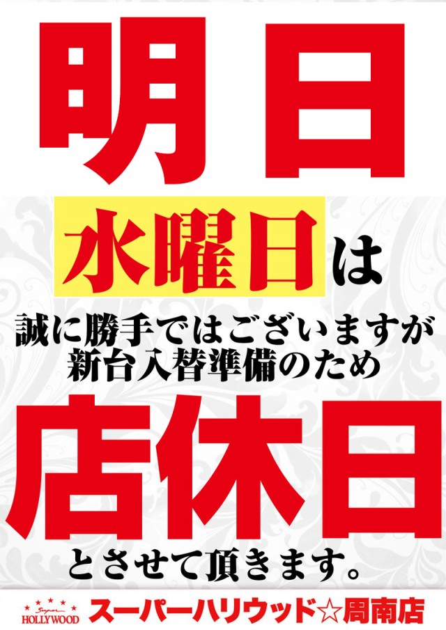 本日11/19(水)店休日 明日11/20(木)新台入替予定