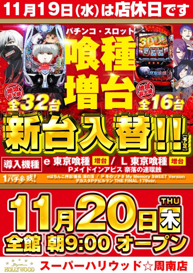明日11/19(水)店休日明後日11/20(木)新台入替予定