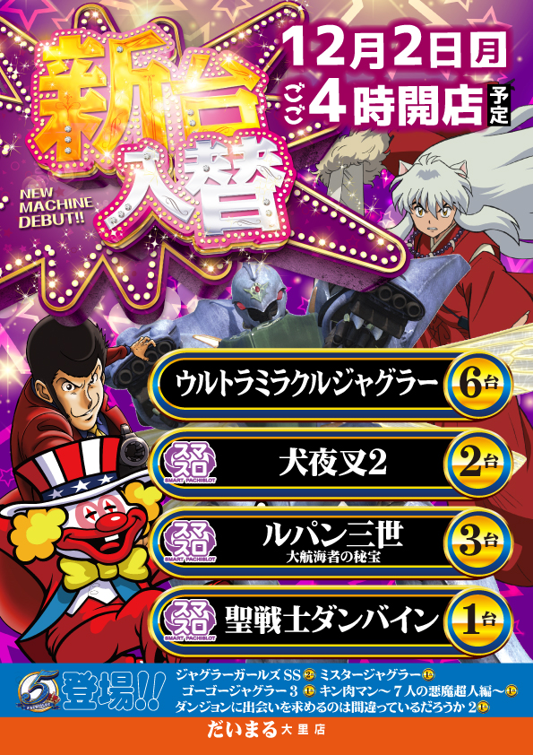 本日12月2日(月)★新台入替★ごご4時オープン!(予定)
