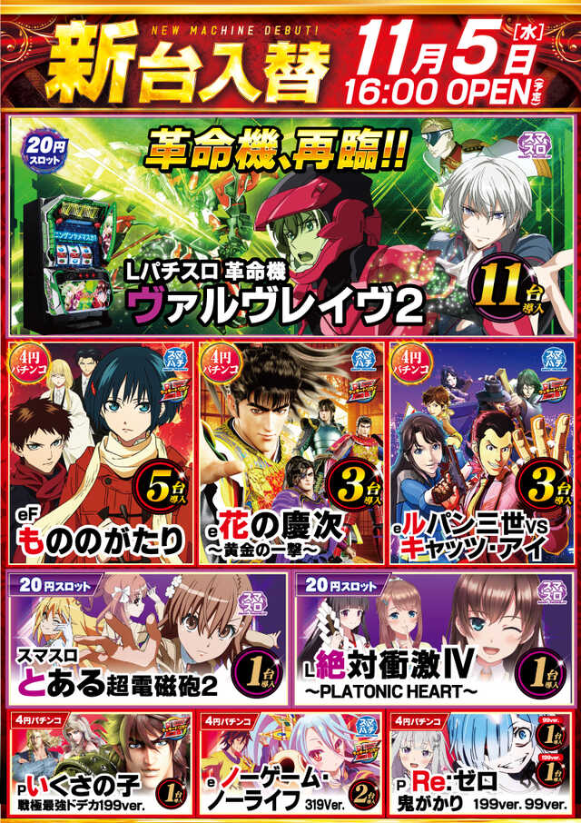 明日11/5(水)★新台入替16時開店予定‼お待ちしてます