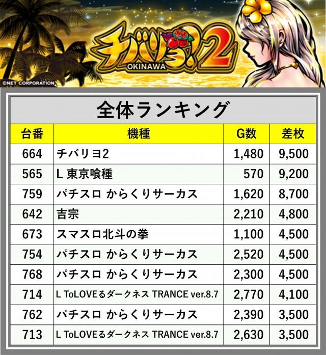 厳選された取材対象機種をはじめ、その他スロット全体から好記録が飛び出した!プレイヤーが楽しんだ1日を下記データにて振り返ってみて欲しい。