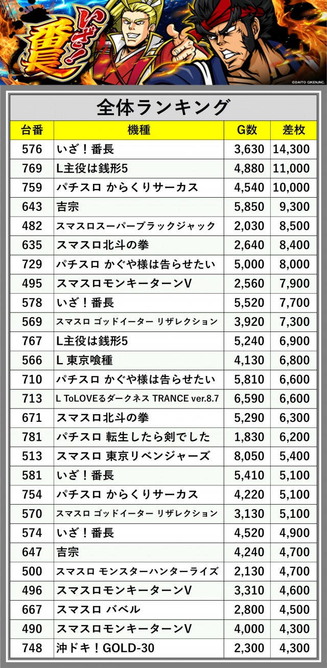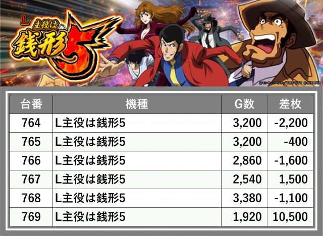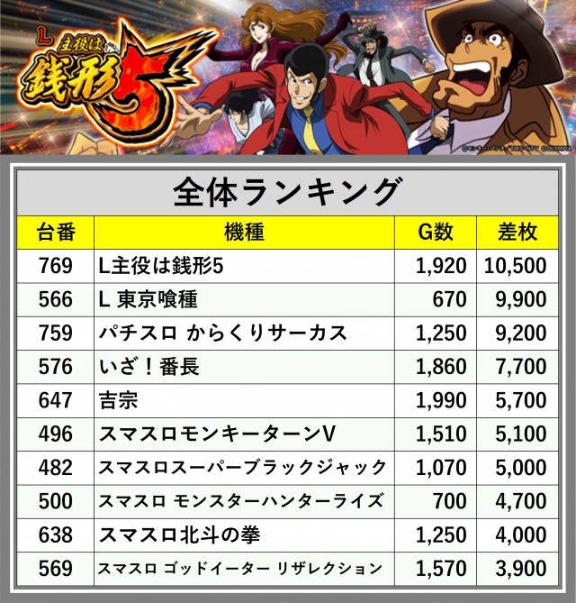 厳選された取材対象機種をはじめ、その他スロット全体から好記録が飛び出した!プレイヤーが楽しんだ1日を下記データにて振り返ってみて欲しい。