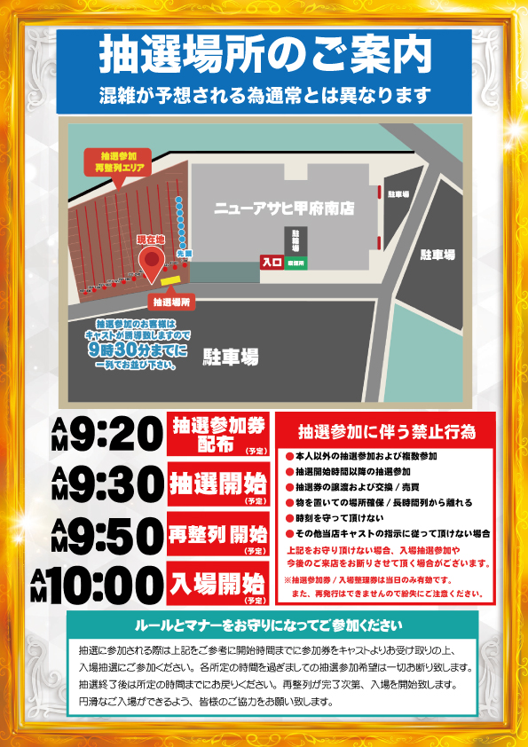 9時20分~抽選参加券配布。9時30分~入場順番抽選会開始。 |