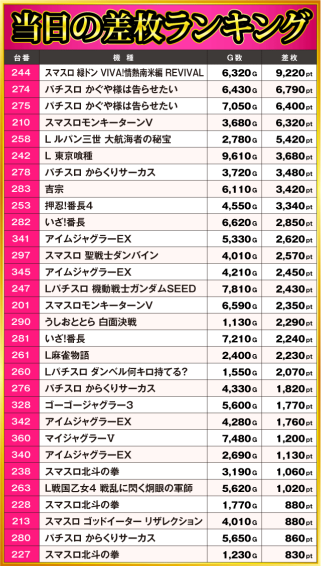 当日の差枚ランキング