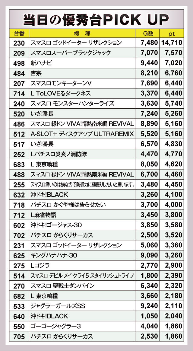 ひときわ目立っていたのが『スマスロ ゴッドイーター リザレクション』。230番台が+14,710ptと1万ptオーバーを達成している。続いて『スマスロスーパーブラックジャック』209番台の+7,570pt、『新ハナビ』498番台の+7,020ptと並ぶ。以下にも『吉宗』484番台の+6,760ptなどなど、かなりの優秀台がひしめき合っていた。