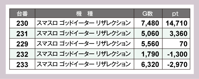 『スマスロ ゴッドイーター リザレクション』は5台中3台がプラスで、1万pt超え含む2台の大活躍が見られた。
