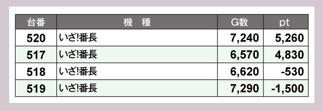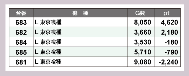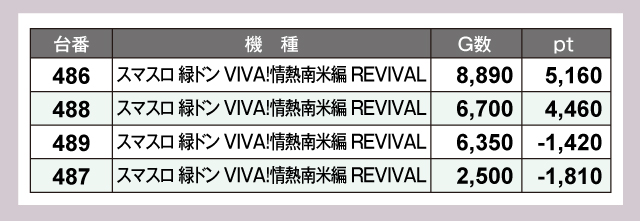 『いざ!番長』と『スマスロ 緑ドン VIVA!情熱南米編 REVIVAL』はどちらも4台中2台がプラスpt。人気の『L 東京喰種』はいずれの台も高稼働で、とくに683番台が優秀な成績となった。