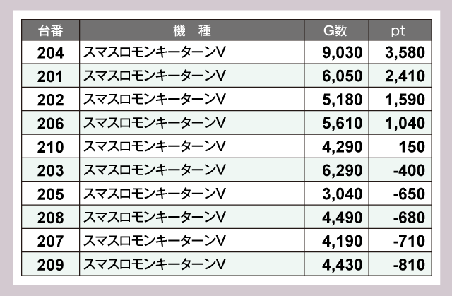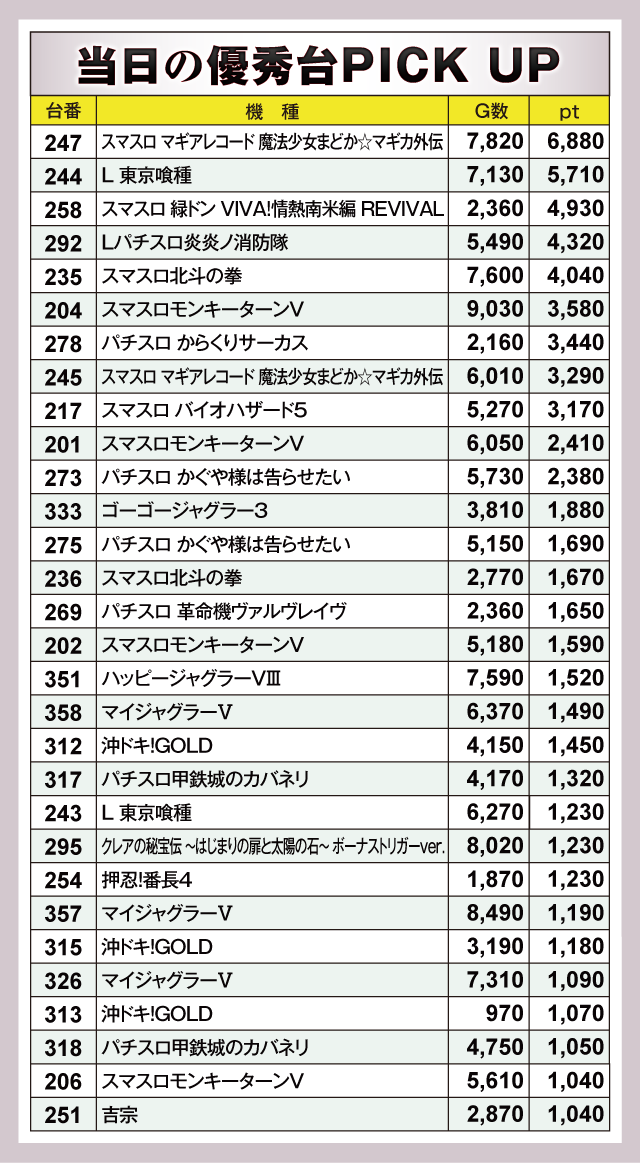 ひときわ輝いていたのは『スマスロ マギアレコード 魔法少女まどか☆マギカ外伝』。247番台が+6,880ptと好成績をおさめている。そして『L 東京喰種』244番台が+5,710ptでつづいた。他にも『スマスロ 緑ドン VIVA!情熱南米編 REVIVAL』258番台の+4,930pt、『Lパチスロ炎炎ノ消防隊』292番台の+4,320pt、『スマスロ北斗の拳』235番台の+4,040ptが並ぶ。以下にも多数の優秀台が誕生し、見応えのあるデータができあがっていた。