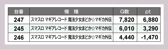 『スマスロ マギアレコード 魔法少女まどか☆マギカ外伝』は3台中2台がプラスpt。もっともG数が回された247番台が大きな成果をあげた。
