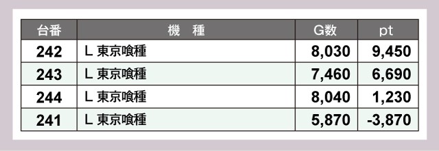 『L 東京喰種』は4台中3台がプラスpt。242番台が+9,000pt超を果たし、トータルでも大きくプラスとなっていた。