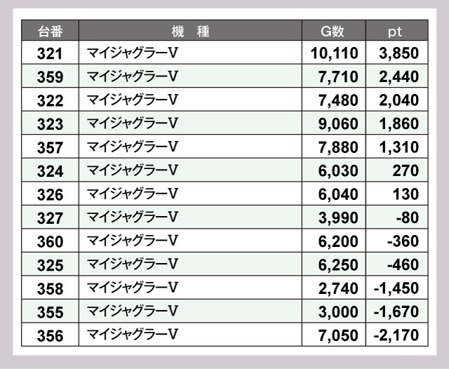この日最も注目を集めたのは『L 東京喰種』。242番台が+9,450pt、243番台が+6,690ptと誰もがうらやむ結果を残している。続いて『スマスロ 新鬼武者3』284番台が+6,500pt、『L主役は銭形5』247番台が+6,360ptと並び、なんとも見応えのあるデータを形成していた。