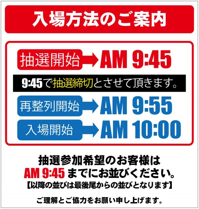 (1)朝9時45分より整理券配布(抽選)(2)9:55分番号順に整列(3)10:00入場開始 ※混雑が予想される場合には、抽選時間が変更となる場合があります。店舗にご確認ください。 |