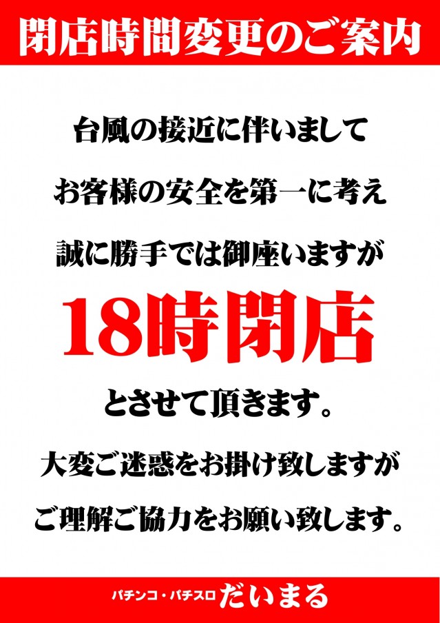 台風の接近に伴い、本日18時閉店なります。