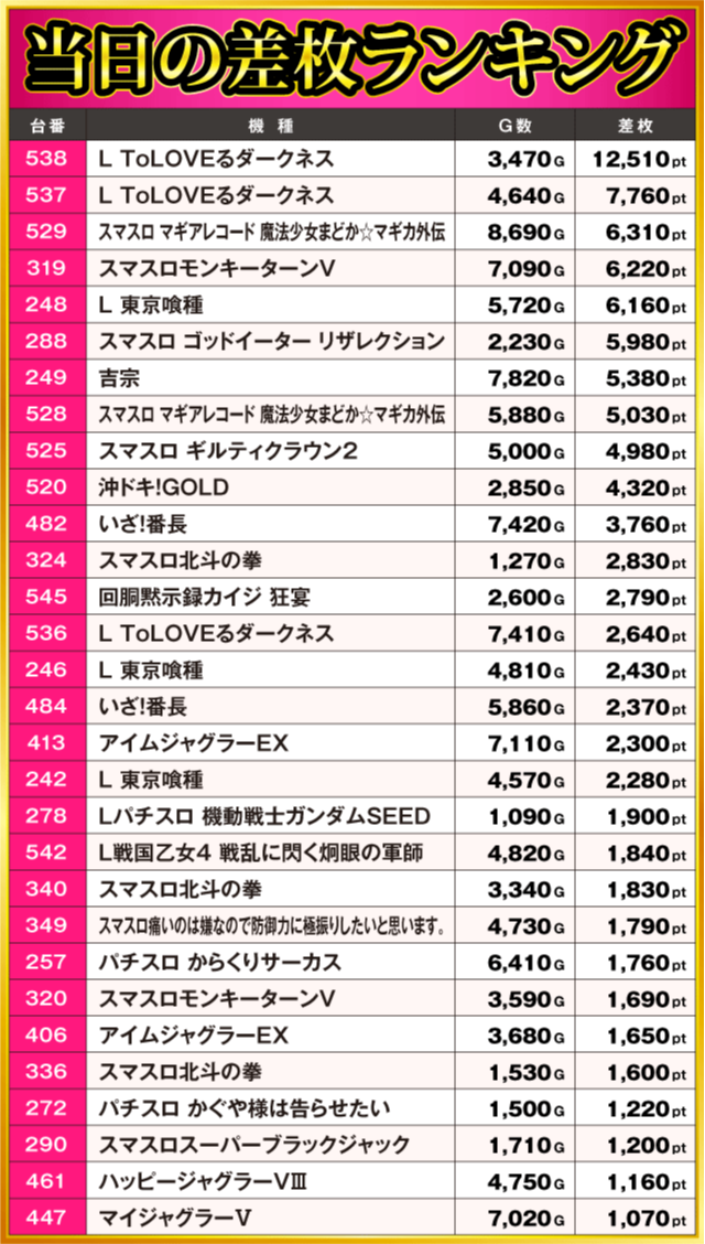 この日、最もプレイヤーの注目を集めていたのが『L ToLOVEるダークネス』で、538番台が万枚超の+12,510pt、537番台が+7,760ptとハイスコアを連発。さらに、『スマスロ マギアレコード 魔法少女まどか☆マギカ外伝』と『スマスロモンキーターンV』、『L 東京喰種』から+6,000pt超が飛び出し店内を盛り上げていた。