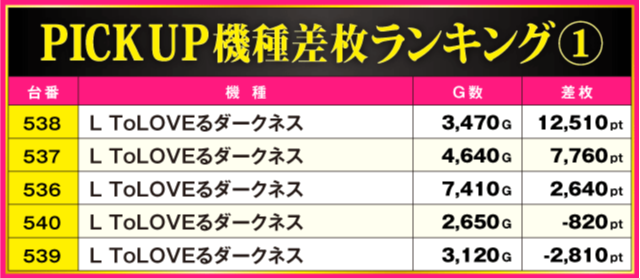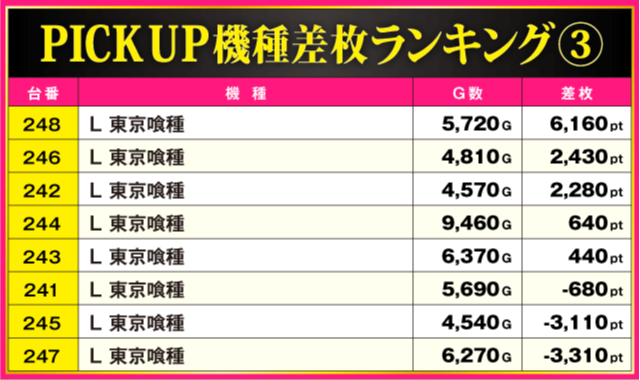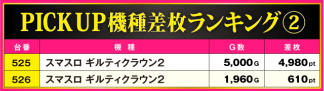 次にPICK UP機種の状況を見ていこう。好成績が続出した『L ToLOVEるダークネス』は最終的に全5台中3台がプラス差枚となる見事な結果を残している。また、『スマスロ ギルティクラウン2』からは+4,980pt、『L 東京喰種』からは+6,160ptが確認されているだけに、それぞれのシマは常に活気に満ち溢れる一日となった。