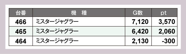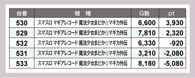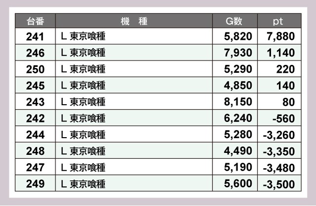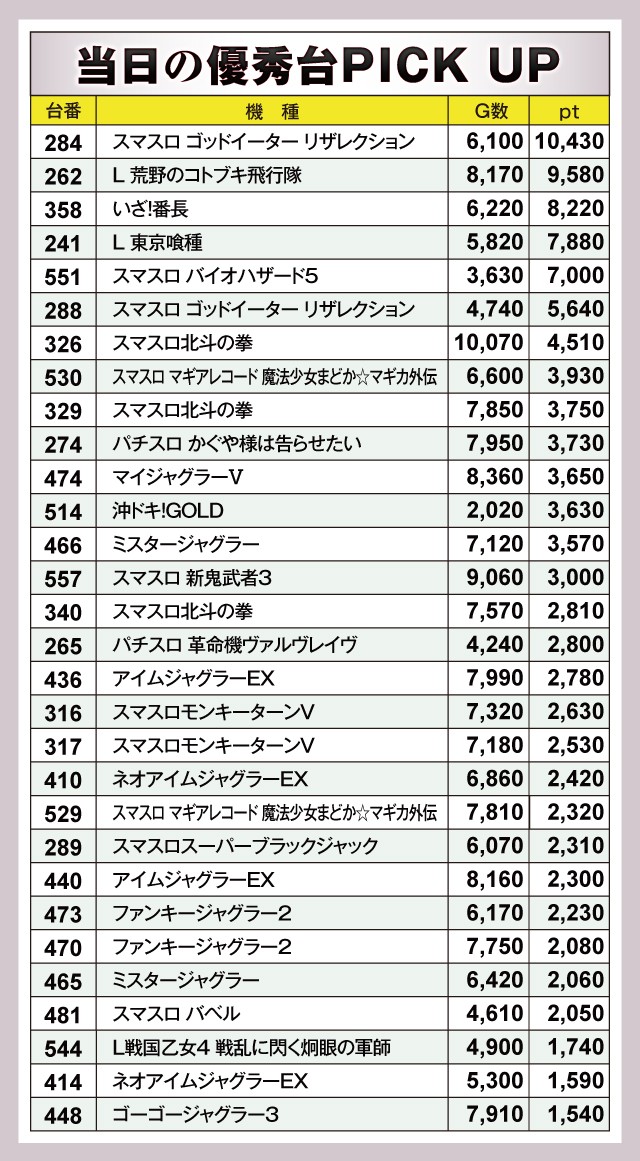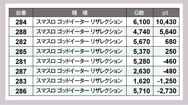 抜きん出た成績を残したのは『スマスロ ゴッドイーター リザレクション』。284番台が+10,430ptと1万ptを達成していた。そして『L 荒野のコトブキ飛行隊』262番台が+9,580pt、『いざ!番長』358番台が+8,220ptと負けず劣らずのptでつづく。以下にも多数の優秀台が誕生し、豪華なデータを見せてくれた。