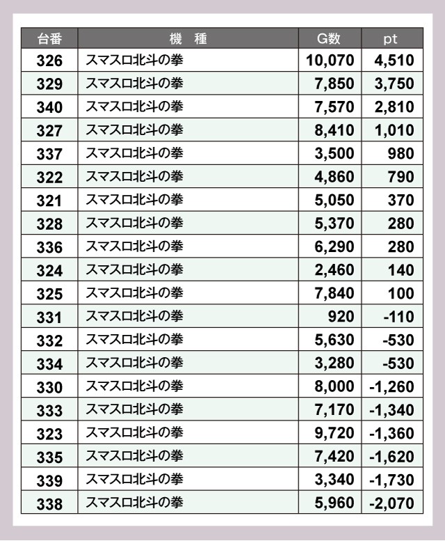 『スマスロ ゴッドイーター リザレクション』は1万pt超え、『スマスロ北斗の拳』は+4,000pt超と大幅プラスptな台を多数確認。