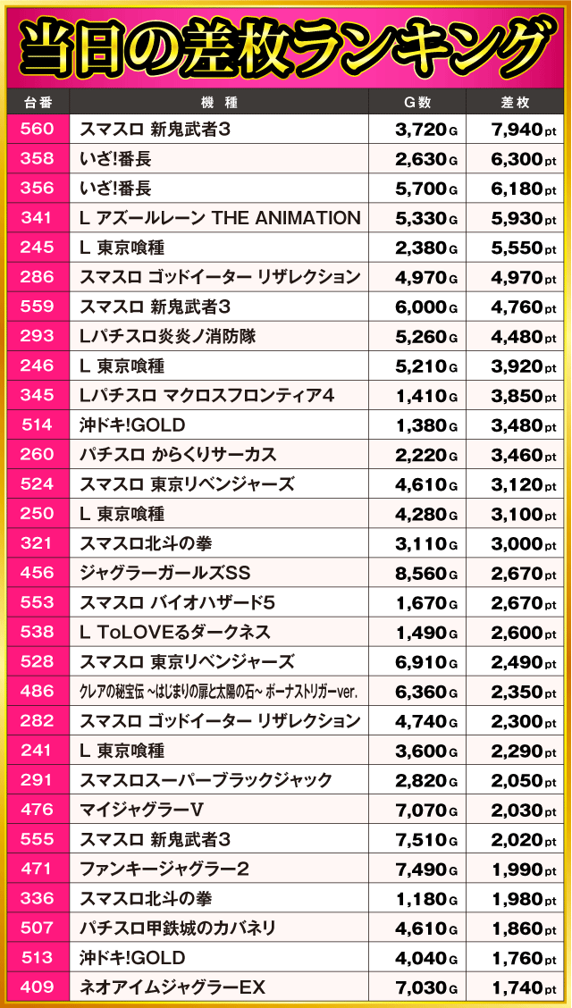 この日は、『スマスロ 新鬼武者3』が+7,940ptを叩き出しランキングトップに。次いで『いざ!番長』から+6,000pt超が2台、『L アズールレーン THE ANIMATION』と『L 東京喰種』から+5,000pt超が飛び出すなど、人気のスマスロを中心に多数のハイスコアが確認されている。