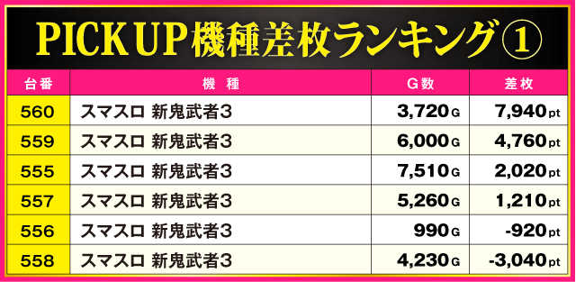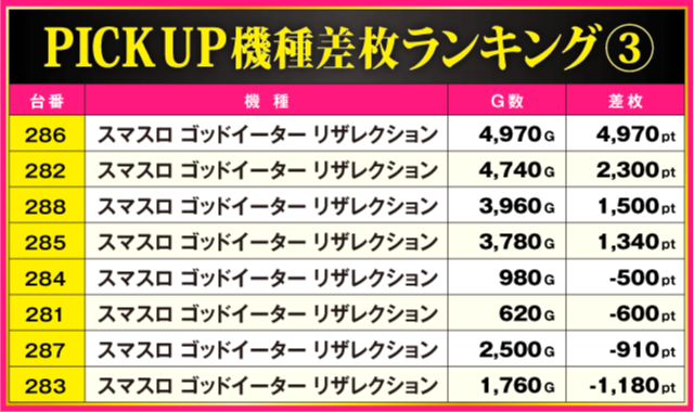 今回のPICK UP機種は全3機種。差枚上位にランクインした『スマスロ 新鬼武者3』と『いざ!番長』以外にも『スマスロ ゴッドイーター リザレクション』から+4,970ptが確認されている。さらに、最終的に3機種トータルの全19台中10台がプラス差枚となっているだけに、それぞれのシマは常にファンの笑顔と活気に満ち溢れていた。