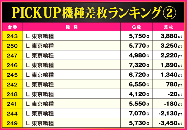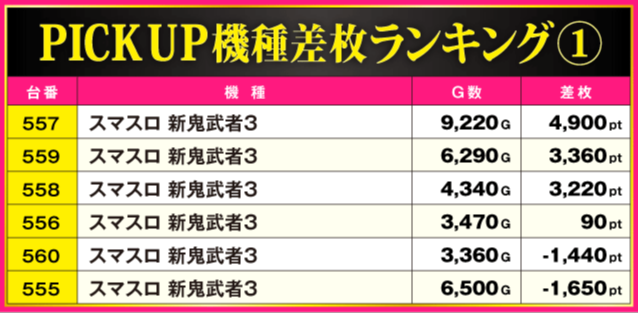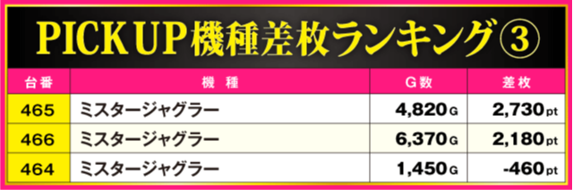 次にPICK UP機種の状況をチェックしていくと、『スマスロ 新鬼武者3』は+4,900pt、『L 東京喰種』は+3,000pt超が2台発生する盛況ぶりを披露。また、『ミスタージャグラー』は全3台中2台がプラス差枚となっているだけに、それぞれのシマは常に活気に満ち溢れる一日となった。