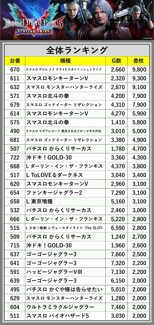厳選された取材対象機種をはじめ、その他スロット全体から好記録が飛び出した!プレイヤーが楽しんだ1日を下記データにて振り返ってみて欲しい。