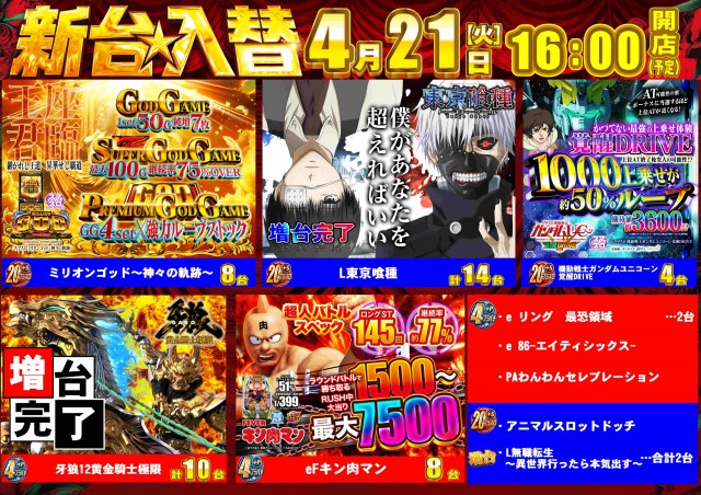 本日新台入替16時OPEN!!(予定)