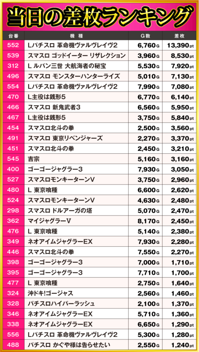 この日、最もプレイヤーの注目を集めたのが話題の新台『Lパチスロ 革命機ヴァルヴレイヴ2』で、552番台が+13,390pt、554番台が+7,080ptとハイスコアを連発。そのポテンシャルの高さを早くも披露し店内を盛り上げていた。また、その他にも『スマスロ ゴッドイーター リザレクション』から+8,530pt、『Lルパン三世 大航海者の秘宝』から+7,920ptが飛び出している。