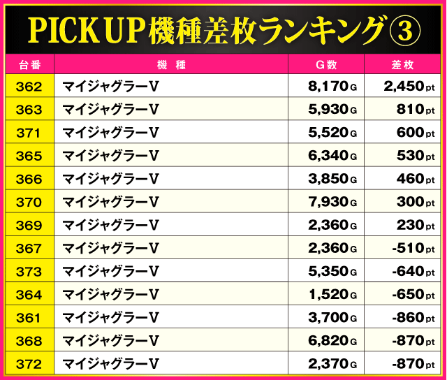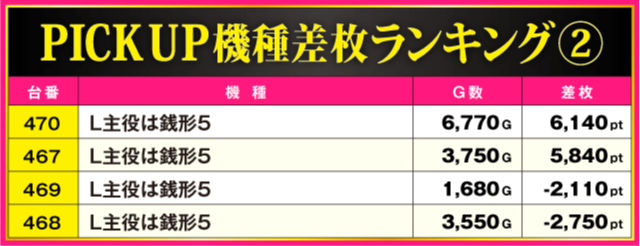 次にPICK UP機種の状況を見ていくと、『スマスロ北斗の拳』からは+3,000pt超が2台、『L主役は銭形5』からは+6,140pt、+5,840ptといった好成績が発生。さらに、『マイジャグラーⅤ』は+2,450ptをはじめ半数以上の台がプラス差枚となっているだけに、それぞれのシマは常に活気に満ち溢れる一日となった。