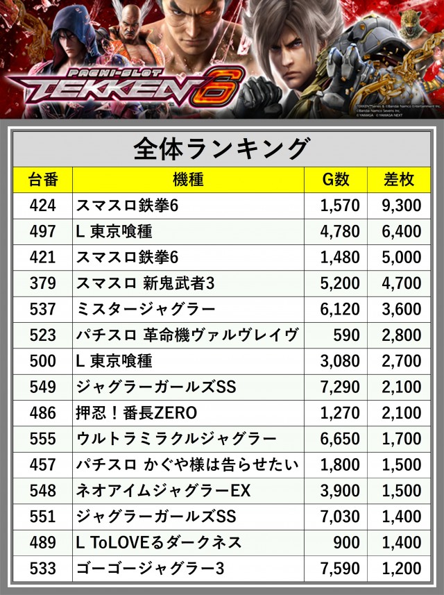 厳選された取材対象機種をはじめ、その他スロット全体から好記録が飛び出した!プレイヤーが楽しんだ1日を下記データにて振り返ってみて欲しい。