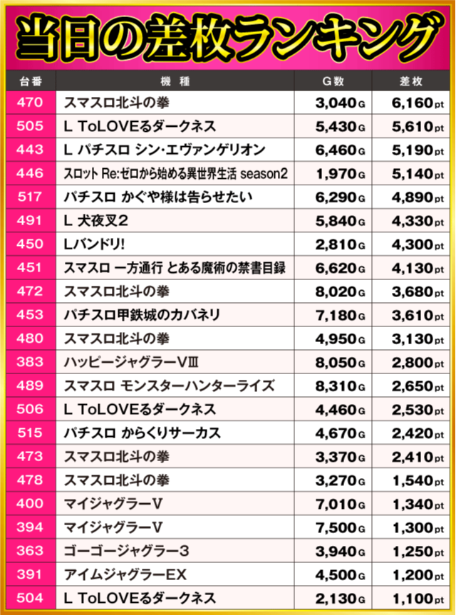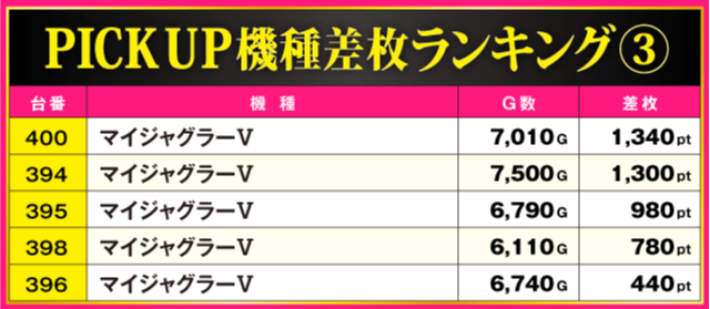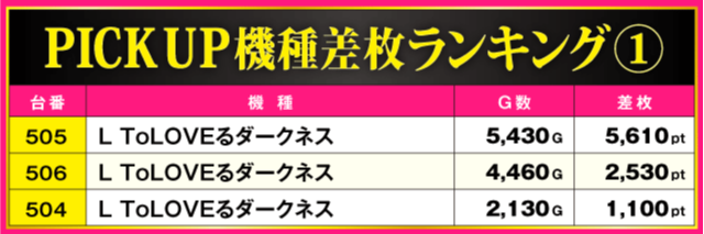 続いてPICK UP機種をチェック!! 『L ToLOVEるダークネス』は全ての台がプラス差枚且つ上位22台に入る好成績を残している。また、『スマスロ北斗の拳』は全14台中5台、『マイジャグラーⅤ』は全7台中5台がそれぞれ上位にランクインしているだけに、ファンにとっては充実の一日になったと言えるだろう。