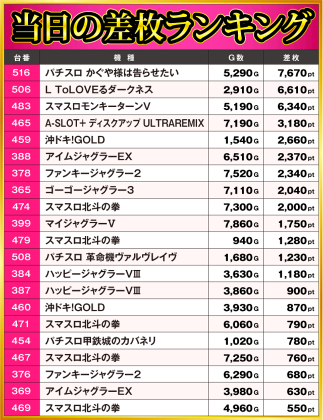 当日の差枚ランキング
