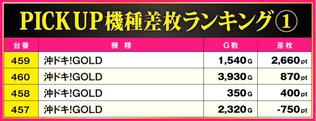 今回のPICK UP機種は『沖ドキ!GOLD』で、スマスロに負けない盛況ぶりを見せていた。特に459番台から+2,660ptが発生、さらに、全4台中3台がプラス差枚で実戦を終えているだけに、ファンにとっては充実の一日となったに違いないだろう。